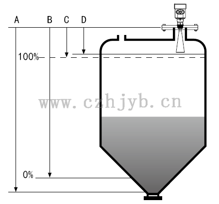 注:使用雷達(dá)物位計(jì)時(shí),務(wù)必保證最高料位不能進(jìn)入測(cè)量盲區(qū)(圖中D所示區(qū)域)。