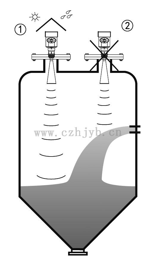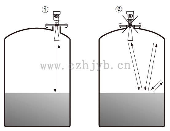 Ø 儀表不能安裝在拱形或圓形罐頂中間。除了會(huì)產(chǎn)生間接回波還會(huì)受到多次回波的影響。多次回波可能比真正回波的信號(hào)閥值還大,因?yàn)橥ㄟ^頂部可集中多個(gè)回波。所以不能安裝在中心位置。